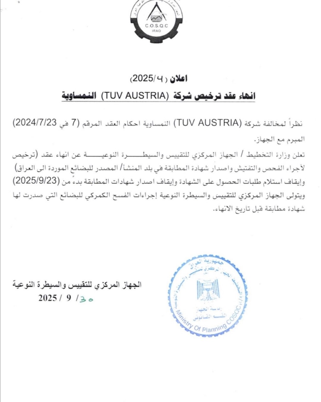 اعلان رقم (٤ / ٢٠٢٥) انهاء عقد ترخيص شركة( TUV AUSTRIA) النمساوية