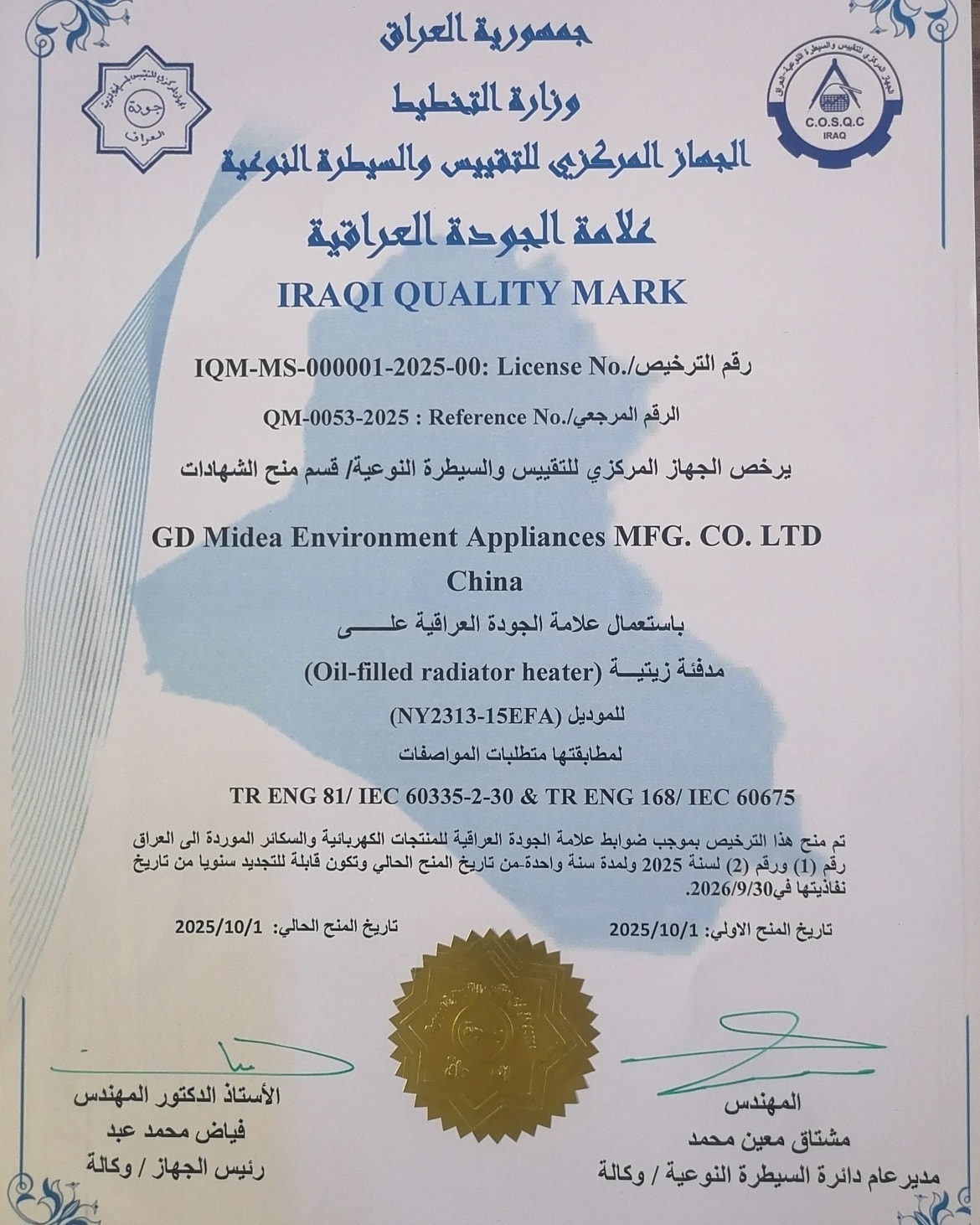 منح الجهاز المركزي للتقييس والسيطرة النوعية / قسم منح الشهادات، علامة الجودة العراقية للشركة الصينية "GD Midea Environment Appliances MFG. CO. LTD" China على منتجها "المدفئة الزيتية" (Oil-filled radiator heater) للموديل (NY2313-15EFA). وجاء منح العلامة وفق ضوابط رقم (1) و(2) لسنة 2025 الخاصة بتخويل منح علامة الجودة العراقية للمنتجات الموردة الى العراق وفق قرار المجلس الوزاري للأقتصاد , ومن الجدير بالذكر ان شركة ميديا تعتبر أول شركة حصلت على علامة الجودة العراقية وفق الضوابط أعلاه من قبل الجهاز المركزي للتقييس و السيطرة النوعية بعد إكمال إجراءات المنح من قبل شركة مسار الخبراء المخولة للقيام بالتفتيش الموقعي في بلد المنشأ وتمثل علامة الجودة العراقية ضمانة رسمية للمستهلك العراقي بجودة وسلامة المنتج، كما تعكس حرص الجهاز المركزي على حماية المستهلك من المنتجات الرديئة وغير المطابقة، والارتقاء بمستوى جودة السلع المستوردة والمصنعة محلياً