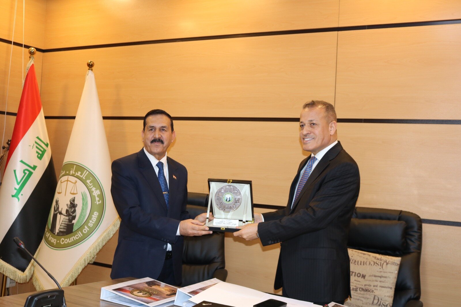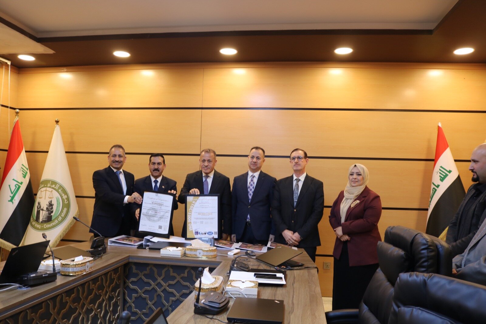 يشكّل حصول مجلس الدولة العراقي على شهادة الجودة الدولية (ISO 9001) إلى جانب الشهادة المحلية المعتمدة خطوة استراتيجية تعزز مكانته كمؤسسة قانونية رائدة تلتزم بأعلى معايير الجودة والكفاءة المؤسسية. ويُعد هذا الإنجاز ثمرة لجهود متواصلة في تطبيق نظام إدارة الجودة الشاملة عبر مختلف الإدارات والأقسام، بما ينعكس إيجابًا على مستوى التشريعات والفتاوى والأحكام الصادرة عنه. كما يسهم في ترسيخ ثقة المواطنين والمستثمرين بالمؤسسات الوطنية، ويدعم بناء بيئة قانونية مستقرة وفاعلة تعزز مسار التنمية وسيادة القانون. وبهذه المناسبة، قدّم رئيس مجلس الدولة الدكتور كريم خصباك درع التميز إلى الأستاذ الدكتور المهندس فياض محمد عبد، رئيس الجهاز المركزي للتقييس والسيطرة النوعية ونائب رئيس لجنة سياسة الجودة الوطنية في العراق، تقديرًا لجهوده الداعمة لمسار الجودة وتعزيز ثقافة التميز محليًا ودوليًا. من جانبه، أكد رئيس الجهاز أن نيل شهادة الجودة يمثل إنجازًا نوعيًا يُضاف إلى سجل مجلس الدولة العراقي الحافل بالعطاء، وخطوة مهمة نحو ترسيخ ثقافة الجودة والتميز المؤسسي في العمل القانوني والإداري، بما ينسجم مع التوجهات الوطنية لتطوير الأداء الحكومي والارتقاء بمستوى الخدمات المقدمة.