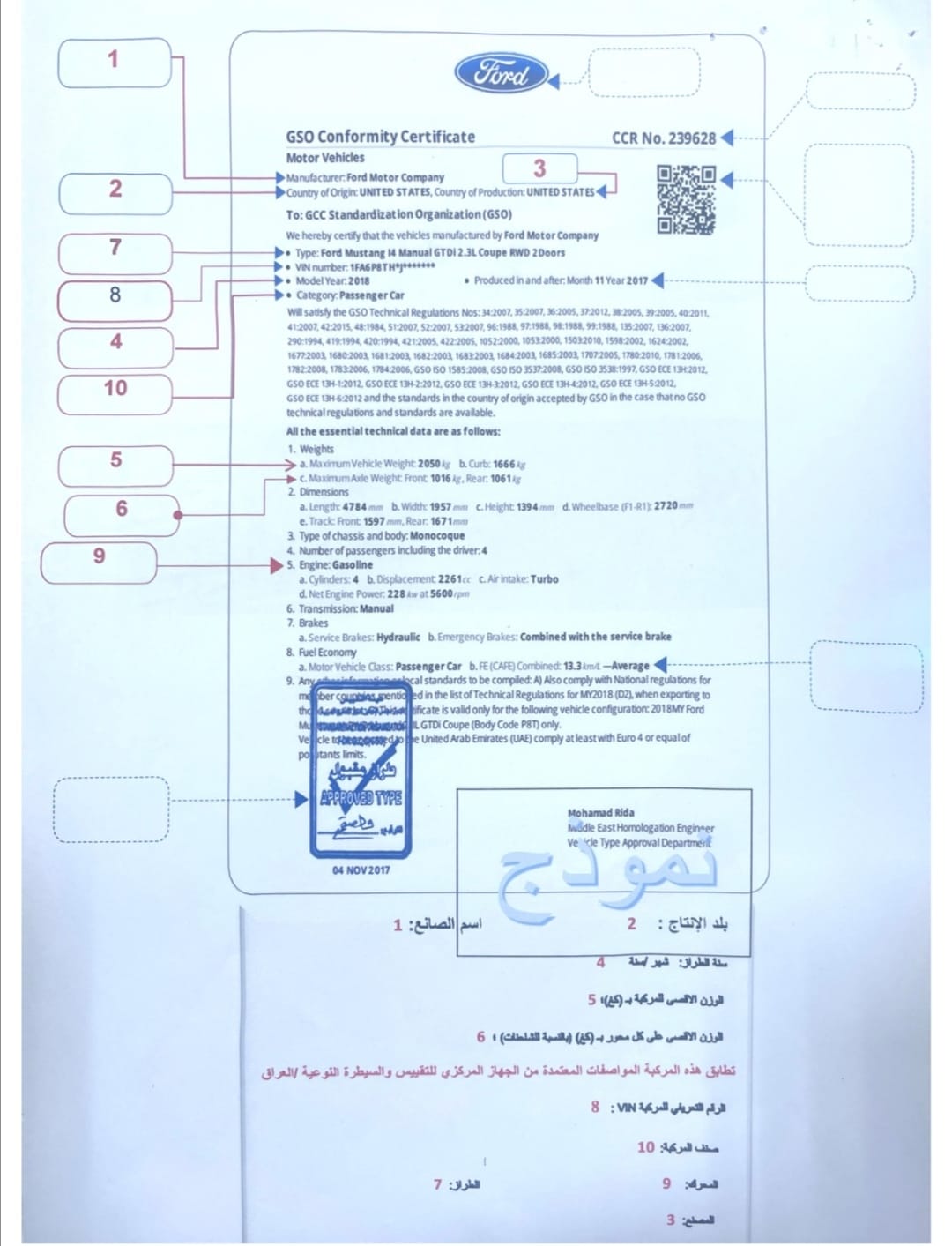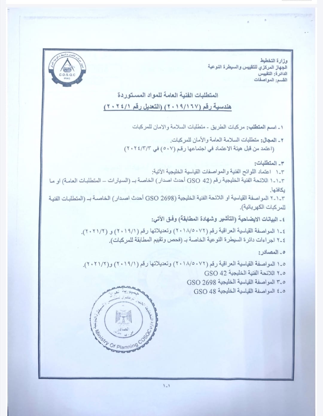 تنفيذا لتوصية لجنة الامر الديواني رقم (37) لسنة 2024 المصادق عليها من قبل المجلس الوزراي للاقتصاد وفقا للقرار رقم (24253 ق) الصادر بالعدد 2410702 في 22/8/2024 الموضوع الثالث من محضر الجلسة الاولى الفقرة (2) وقرار التأجيل رقم (25083 ق) الصـــــادر بالعدد 2510099 فـــي 12/3/2025 ، ندرج ادناه الـــية تقييم المـــطابقة للمــــركبات الجديدة (غير المستعملة) :- اعتماد اللوحة التعريفية الخاصة ببند التأشير على ان يكون مضمون اللوحة التعريفية كما مدرج في النسخة المرفقة ربطا استنادا الى القرار انفا . يجب ان تثبت اللوحة التعريفية على حافة باب السائق او عمود مزلاج الباب في كل مركبة (كما مرفق ربطا) وتلبي المتطلبات التالية :- ان تكون من مادة مقاومة للتلف ولا يمكن ازالتها دون تلف. تكتب معلومات اللوحة التعريفية باللغة العربية بشكل واضح . لون خلفية اللوحة التعريفية (ابيض) ولون الكتابة (اسود) ونوع الخط (Arial). لا تقل ابعاد اللوحة التعريفية عن (10) سم الطول و (5) سم العرض. استمرار العمل بآلية تقييم المطابقة للمركبات الجديدة (غير المستعملة) المشار اليها في كتابنا ذي العدد (3353) في 13/11/2024. يتم تقييم المطابقة للمركبات الجديدة (غير المستعملة) اعتبارا من 1/1/2026 من قبل الجهاز من خلال تقييم المطابقة الاولي ويتم تقييم المطابقة النهائي من قبل الشركة المخولة بتفتيش المركبات في المنافذ الحدودية باعتماد المتطلبات الواردة في الفقرتين (1 ، 2) اعلاه كاساس لعملية تقييم المطابقة للمركبات الجديدة (غير المستعملة). اللوحات التعريفية المشار اليها اعلاه هي لوحات اضافية و لا تغني عن اللوحات التعريفية المبينة في المواصفات المعتمدة في المتطلب فني عام (هندسية 167/2019) التعديل (1/2024) الخاص بــ(مركبات الطريق-متطلبات السلامة والامان للمركبات). بناءا على الاسئلة الشائعة من قبل موردي المركبات الجديدة (غير المستعملة) الى العراق عبر المنافذ الحدودية ، تم ارفاق نموذج توضيحي لكل ما ورد في اللوحات التعريفية المعتمدة من قبل الجهاز المركزي للتقييس والسيطرة النوعية.