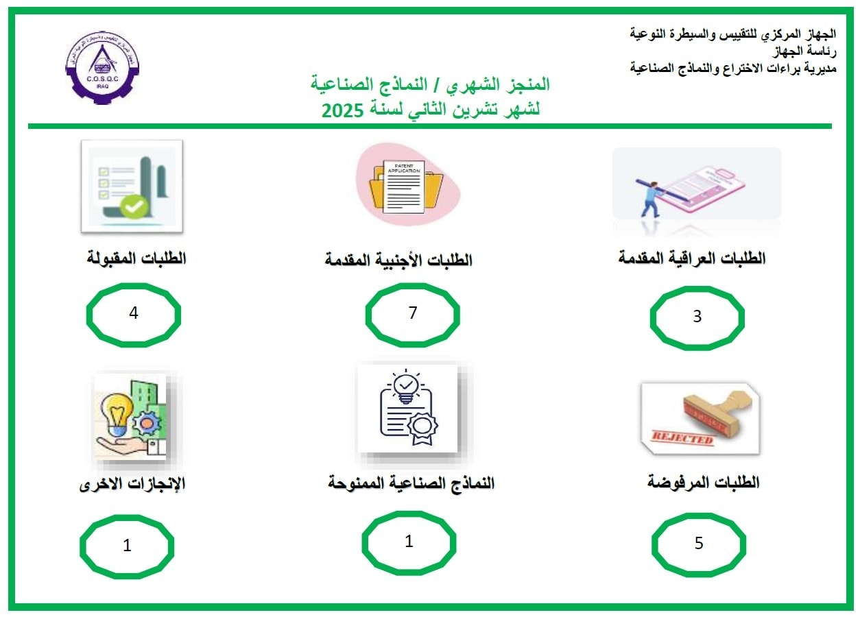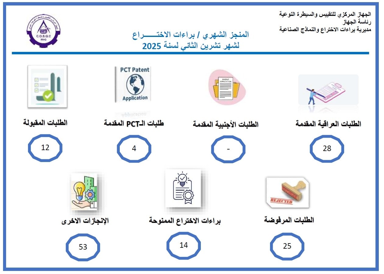 أعلنت مديرية براءات الاختراع والنماذج الصناعية التابعة للجهاز المركزي للتقييس والسيطرة النوعية، التابع لوزارة التخطيط، عن إنجازاتها خلال شهر تشرين الثاني (نوفمبر) 2025. فقد شهد الشهر قبول 12 طلب براءة اختراع (قيد إصدار الشهادة)، ومنح 14 براءة اختراع، مع استلام 28 طلباً عراقياً و4 طلبات دولية وفق نظام معاهدة التعاون بشأن البراءات (PCT). كما تم رفض 25 طلباً لعدم استيفائها الشروط اللازمة لمنح براءة الاختراع. أما في مجال النماذج الصناعية، فقد تم قبول 4 طلبات، ومنح نموذج صناعي واحد، مع استلام 3 طلبات عراقية و7 طلبات أجنبية، في حين تم رفض 5 طلبات لعدم استيفائها الشروط اللازمة. وفي هذا السياق، أشار الأستاذ الدكتور المهندس فياض محمد عبد الدليمي، رئيس الجهاز المركزي للتقييس والسيطرة النوعية، قائلاً: «إن هذه النتائج الإيجابية تعكس التقدم الملحوظ في مجال حماية الملكية الفكرية بالعراق، وتؤكد التزامنا الراسخ بدعم المخترعين العراقيين. نحن مستمرون في تطوير الإجراءات وتسريع معالجة الطلبات لضمان بيئة محفزة للابتكار، وفق أعلى المعايير الدولية، لتعزيز الاقتصاد الوطني ومواكبة التطورات العالمية.» يؤكد الجهاز المركزي للتقييس والسيطرة النوعية استمرار جهوده في تعزيز الابتكار وحماية الملكية الفكرية، ودعم المخترعين والمبتكرين المحليين والدوليين.