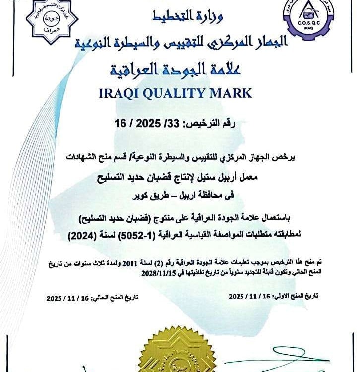 منح الجهاز المركزي للتقييس والسيطرة النوعية، اليوم الثلاثاء، شهادة علامة الجودة العراقية لمعمل "أربيل ستيل" في محافظة أربيل، على منتجات قضبان حديد التسليح التي يصنعها. وتم تسليم الشهادة من قبل السيد رئيس الجهاز المركزي الأستاذ الدكتور المهندس فياض محمد عبد لممثل الشركة ، وبحضور السيد المدير العام لدائرة السيطرة النوعية المهندس مشتاق معين محمد ، و السيد مدير قسم منح الشهادات مصطفى ناظر عبد المنعم . وجاء منح الترخيص بعد تأكد الجهازالمركزي من مطابقة قضبان التسليح المنتجة في المعمل، لمتطلبات المواصفة القياسية العراقية رقم (1-5052) لعام 2024. ليكون بذلك المعمل مؤهلاً لتحمل مسؤولية وضع علامة الجودة العراقية على منتجه، كضمان للمستهلك والمستخدم النهائي بجودته وملاءمته للمواصفات القياسية، بموجب تعليمات علامة الجودة العراقية رقم (2) لسنة 2011، وهو ساري المفعول لمدة ثلاث سنوات من تاريخ منحه الحالي، على أن يكون قابلاً للتجديد سنوياً وفقاً للإجراءات والتقييمات الدورية التي يجريها الجهاز. ومن الجدير بالذكر أن منح علامة الجودة العراقية يعد إجراءً رقابياً وتشجيعياً في آن واحد، يهدف إلى حماية السوق والمستهلك، والارتقاء بجودة المنتجات المحلية، ودعم الشركات الملتزمة بالمواصفات القياسية.