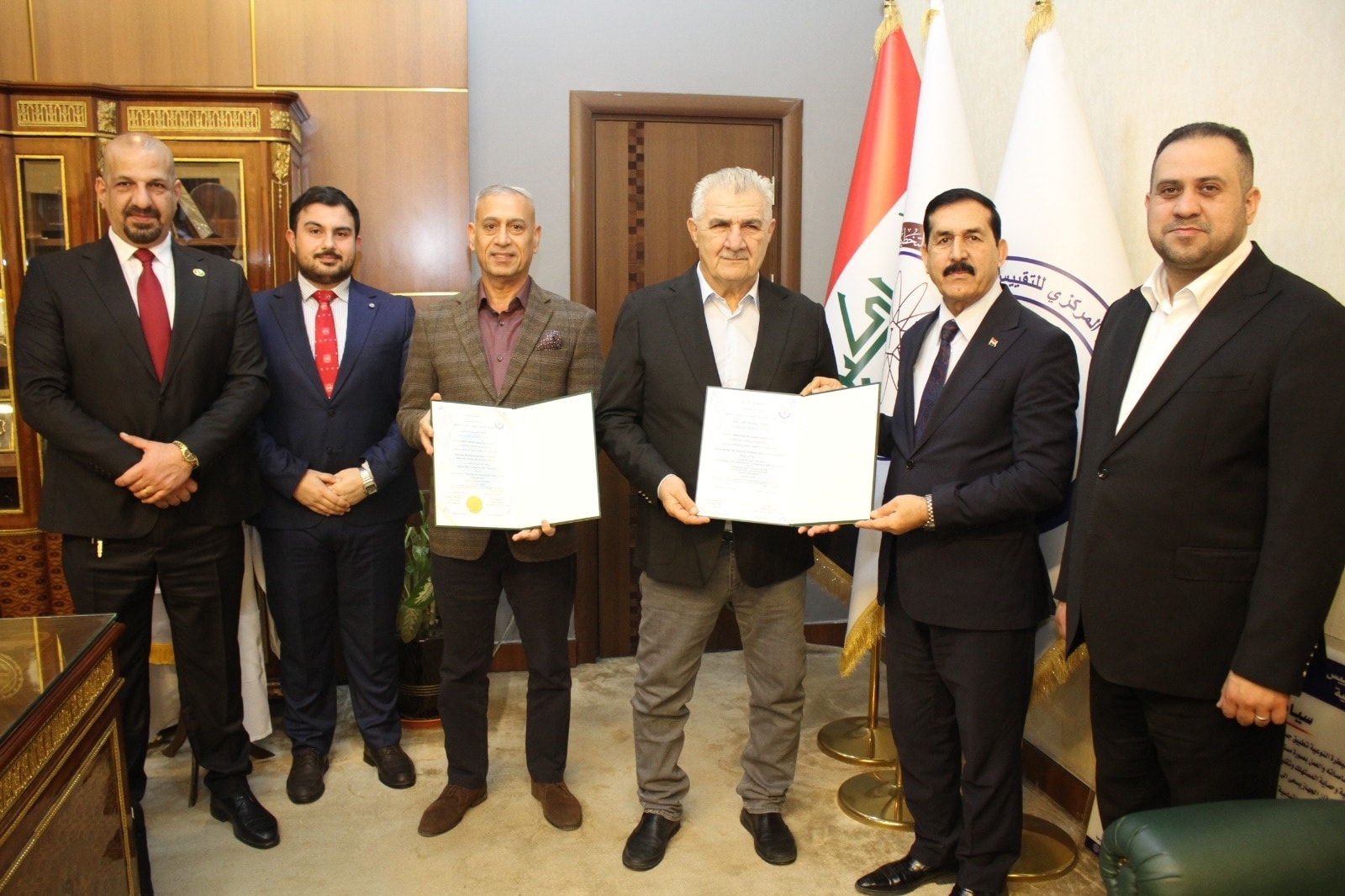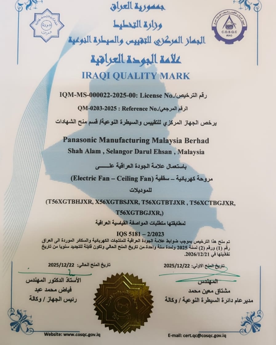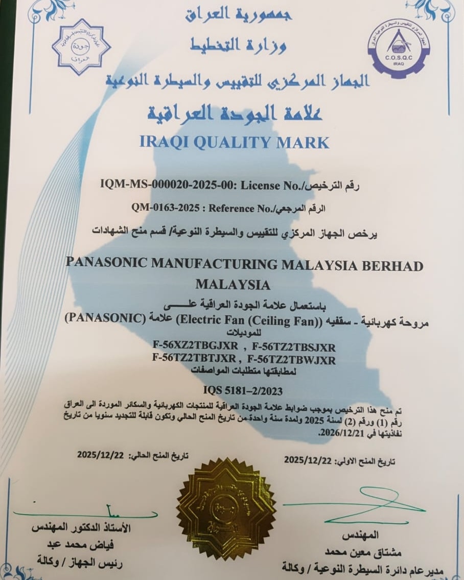 منح الجهاز المركزي للتقييس والسيطرة النوعية، اليوم الخميس، علامة الجودة العراقية لمنتجات المراوح الكهربائية السقفية العائدة لشركة Panasonic Manufacturing Malaysia Berhad، وذلك بعد استكمال متطلبات المطابقة للمواصفات القياسية العراقية المعتمدة. وقام السيد رئيس الجهاز المركزي للتقييس والسيطرة النوعية الأستاذ الدكتور المهندس فياض محمد عبد، بتسليم شهادتي علامة الجودة العراقية، الصادرتين عن قسم منح الشهادات في الجهاز المركزي، بحضور السيد المدير العام لدائرة السيطرة النوعية المهندس مشتاق معين محمد والسيد مدير قسم منح الشهادات مصطفى ناظر عبد المنعم، لالتزام الشركة بالمعايير الفنية ومتطلبات الجودة والسلامة. وشمل الترخيص الأول منح استخدام علامة الجودة العراقية على مروحة كهربائية – سقفية (Electric Fan – Ceiling Fan) من علامة PANASONIC، للموديلات: F-56XZ2TBGJXR، F-56TZ2TBSJXR، F-56TZ2TBTJXR، F-56TZ2TBWJXR، وذلك لمطابقتها متطلبات المواصفة القياسية العراقية IQS 5181-2/2023. كما تضمن الترخيص الثاني منح استخدام علامة الجودة العراقية على مراوح كهربائية – سقفية (Electric Fan – Ceiling Fan) للموديلات: T56XGTBHJXR، X56XGTBSJXR، T56XGTBTJXR، T56XCTBGJXR، T56XGTBGJXR، لمطابقتها أيضًا متطلبات المواصفة القياسية العراقية IQS 5181-2/2023. وجاء منح هذين الترخيصين استنادًا إلى ضوابط علامة الجودة العراقية للمنتجات الكهربائية والسكائر الموردة إلى العراق رقم (1) ورقم (2) لسنة 2025، وبمدة سنة واحدة من تاريخ المنح، على أن تكون قابلة للتجديد سنويًا. وأكد الجهاز المركزي أن منح علامة الجودة العراقية يأتي ضمن جهوده المستمرة في تعزيز جودة المنتجات المتداولة في الأسواق المحلية، وحماية المستهلك، وضمان مطابقة السلع المستوردة للمواصفات القياسية المعتمدة.