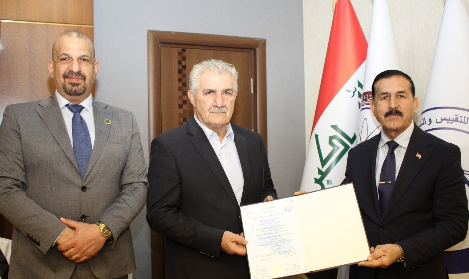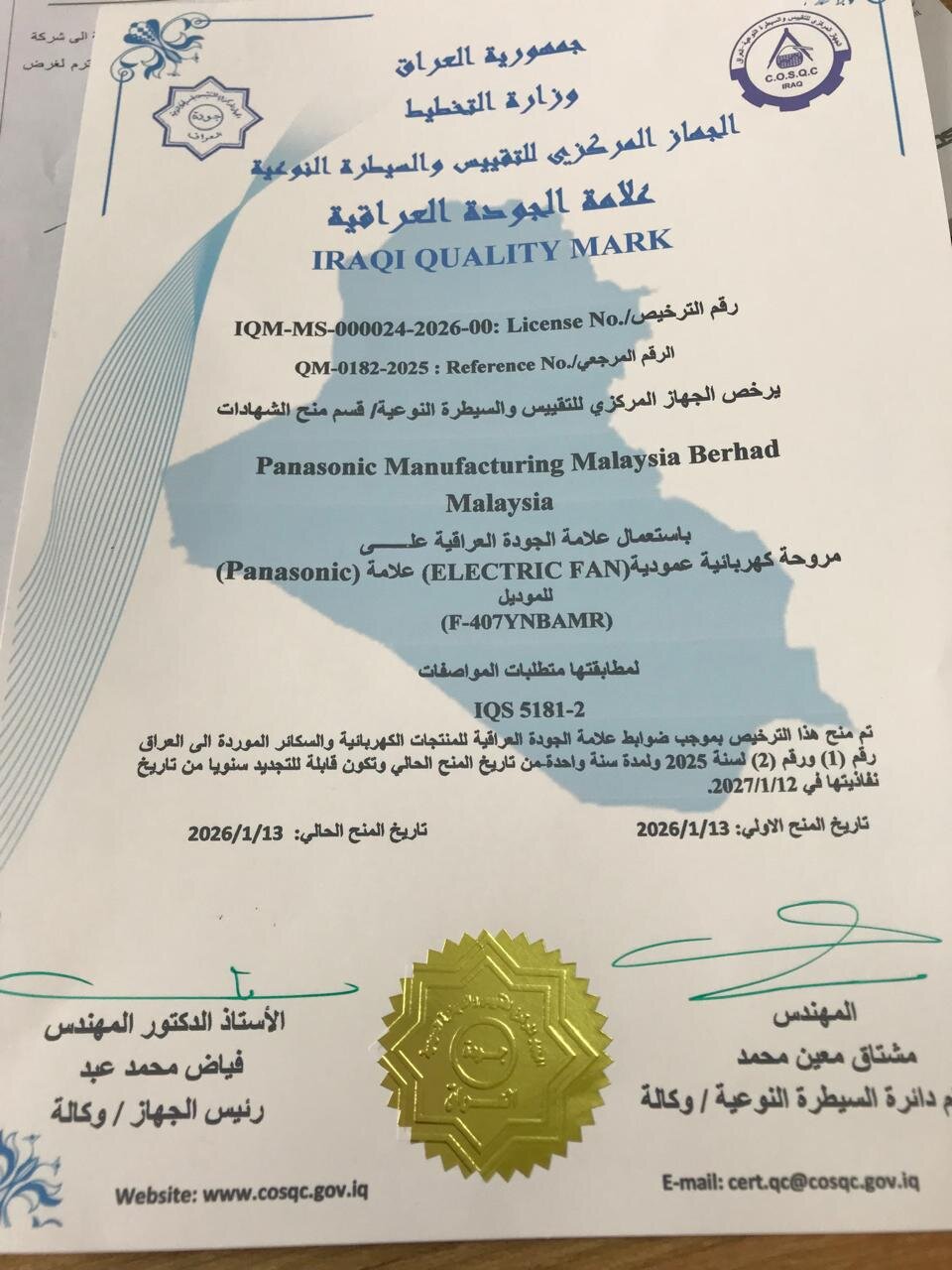 منح الجهاز المركزي للتقييس والسيطرة النوعية، اليوم الاربعاء 28 كانون الثاني 2026، علامة الجودة العراقية لمنتج المروحة الكهربائية العمودية العائدة لشركة Panasonic Manufacturing Malaysia Berhad، وذلك بعد استكمال متطلبات المطابقة للمواصفات القياسية العراقية المعتمدة. وقام السيد رئيس الجهاز المركزي للتقييس والسيطرة النوعية الأستاذ الدكتور المهندس فياض محمد عبد، بتسليم شهادة علامة الجودة العراقية، الصادرة عن قسم منح الشهادات التابع لدائرة السيطرة النوعية في الجهاز المركزي، بحضور مدير قسم منح الشهادات السيد مصطفى ناظر عبدالمنعم، لالتزام الشركة بالمعايير الفنية ومتطلبات الجودة والسلامة. وشمل الترخيص منح استخدام علامة الجودة العراقية على مروحة كهربائية عمودية (Electric Fan) من علامة PANASONIC، للموديل: F-407YNBAMR، وذلك لمطابقتها متطلبات المواصفة القياسية العراقية IQS 5181-2. وجاء منح هذا الترخيص استنادًا إلى ضوابط علامة الجودة العراقية للمنتجات الكهربائية والسـاكنر الموردة إلى العراق رقم (1) ورقم (2) لسنة 2025، وبمدة سنة واحدة من تاريخ المنح، على أن تكون قابلة للتجديد سنويًا. وأكد الجهاز المركزي أن منح علامة الجودة العراقية يأتي ضمن جهوده المستمرة في تعزيز جودة المنتجات المتداولة في الأسواق المحلية، وحماية المستهلك، وضمان مطابقة السلع المستوردة للمواصفات القياسية المعتمدة.