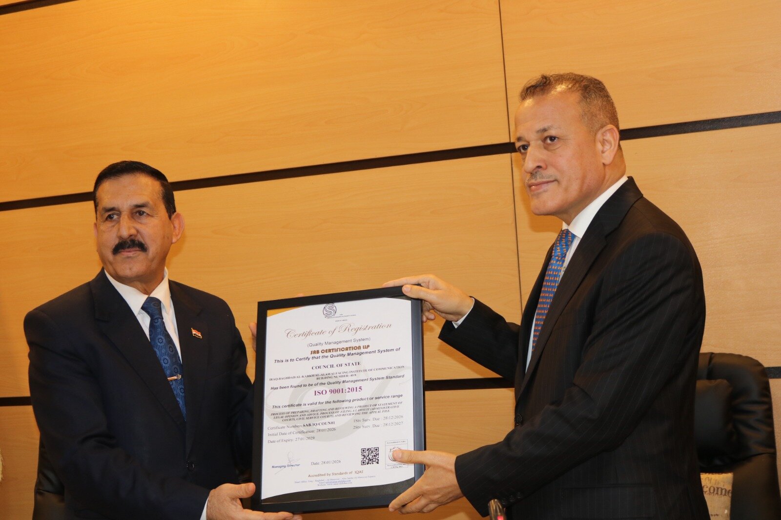يشكّل حصول مجلس الدولة العراقي على شهادة الجودة الدولية (ISO 9001) إلى جانب الشهادة المحلية المعتمدة خطوة استراتيجية تعزز مكانته كمؤسسة قانونية رائدة تلتزم بأعلى معايير الجودة والكفاءة المؤسسية. ويُعد هذا الإنجاز ثمرة لجهود متواصلة في تطبيق نظام إدارة الجودة الشاملة عبر مختلف الإدارات والأقسام، بما ينعكس إيجابًا على مستوى التشريعات والفتاوى والأحكام الصادرة عنه. كما يسهم في ترسيخ ثقة المواطنين والمستثمرين بالمؤسسات الوطنية، ويدعم بناء بيئة قانونية مستقرة وفاعلة تعزز مسار التنمية وسيادة القانون. وبهذه المناسبة، قدّم رئيس مجلس الدولة الدكتور كريم خصباك درع التميز إلى الأستاذ الدكتور المهندس فياض محمد عبد، رئيس الجهاز المركزي للتقييس والسيطرة النوعية ونائب رئيس لجنة سياسة الجودة الوطنية في العراق، تقديرًا لجهوده الداعمة لمسار الجودة وتعزيز ثقافة التميز محليًا ودوليًا. من جانبه، أكد رئيس الجهاز أن نيل شهادة الجودة يمثل إنجازًا نوعيًا يُضاف إلى سجل مجلس الدولة العراقي الحافل بالعطاء، وخطوة مهمة نحو ترسيخ ثقافة الجودة والتميز المؤسسي في العمل القانوني والإداري، بما ينسجم مع التوجهات الوطنية لتطوير الأداء الحكومي والارتقاء بمستوى الخدمات المقدمة.